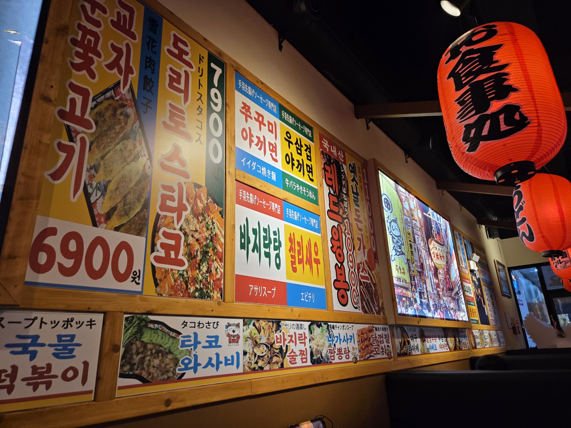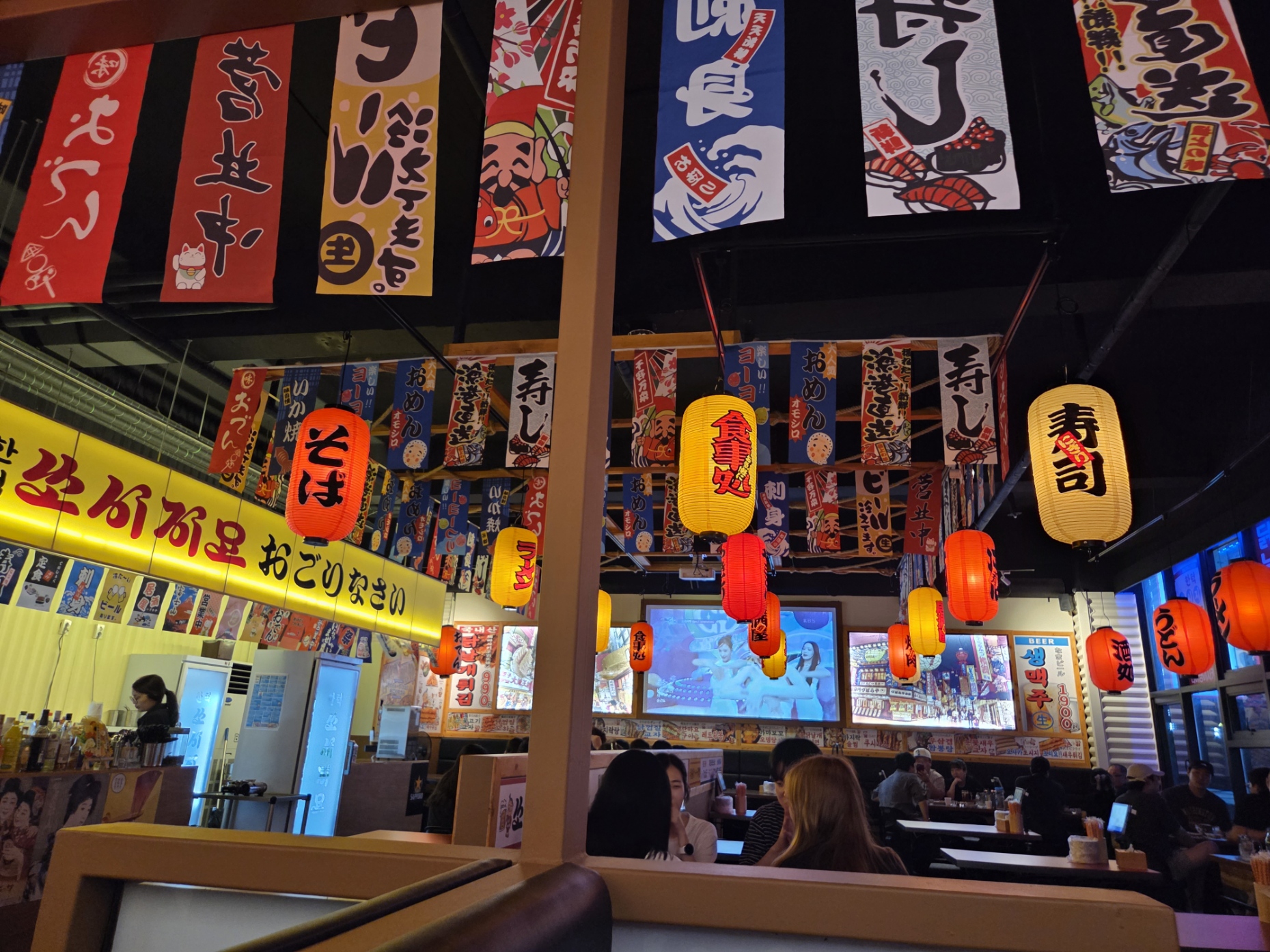 천장부터 일본 표지들과 전등으로 장식되어 있어