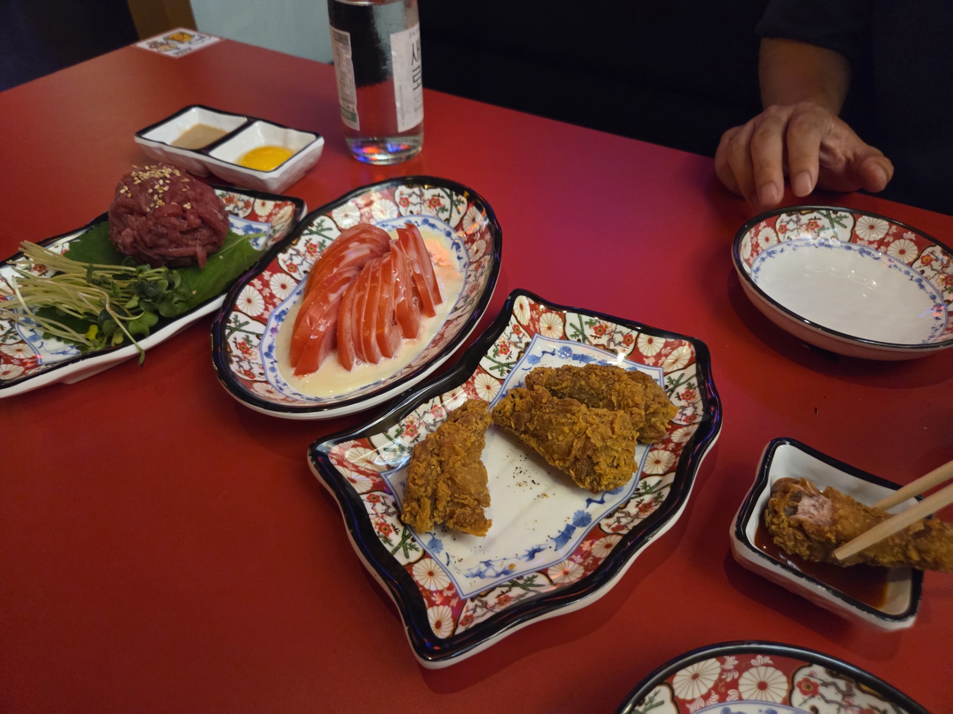 저희는 닭봉 튀김과 토마토+연유, 육회 메뉴를 주문해 봤어요.